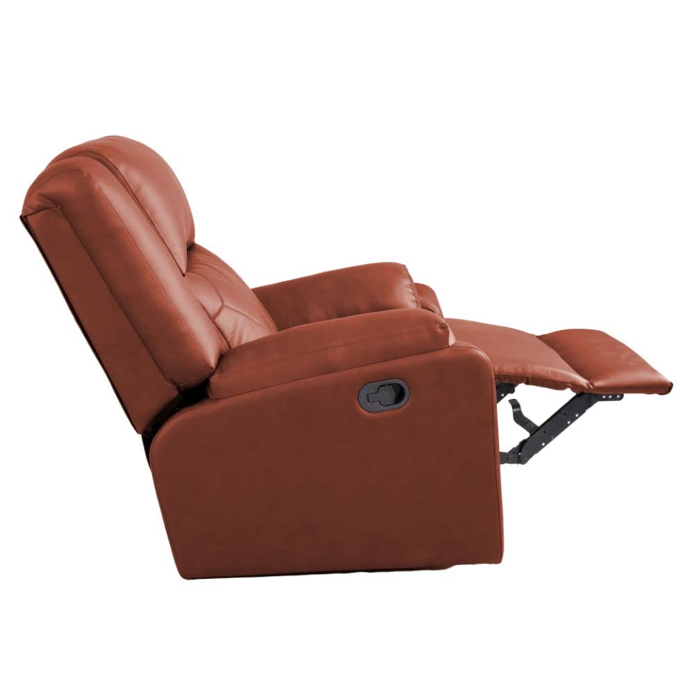 ComfortMax Single Seater Recliner. Upholstered in a high-quality, rich brown leatherette, this recliner combines luxurious looks with exceptional comfort and durability. The plush seating and overstuffed armrests cradle your body, making it the perfect spot for reading, watching movies, or simply unwinding after a long day. A distinctive diamond-quilted pattern on the backrest adds a touch of sophisticated style, ensuring this chair is a statement piece in any living room, den, or home theater. Its easy-to-use reclining mechanism allows you to find your perfect angle of repose effortlessly.